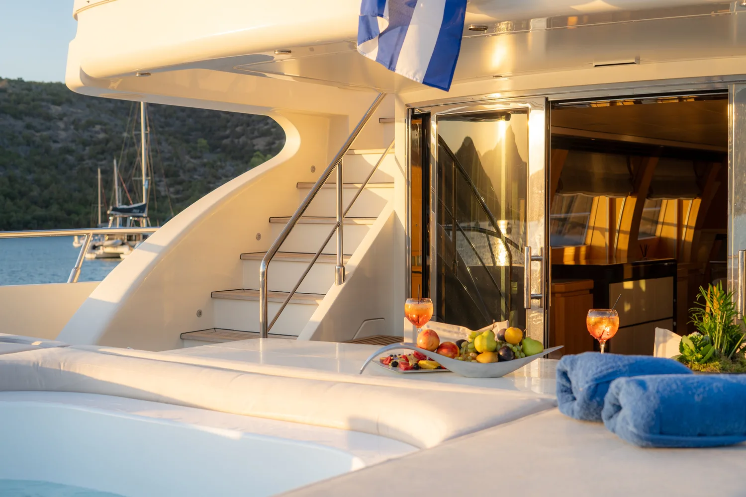 Liberdade offers a modern and spacious interior, highlighted by a stylish central bar on the main deck that sets the tone for relaxed luxury. The full-beam Master Suite, also located on the main deck, serves as a private retreat complete with his and hers en-suite facilities and refined detailing throughout. Designed for superior performance at sea, Liberdade is equipped with stabilizers at anchor and advanced navigation systems to ensure a smooth and comfortable cruising experience. Generous outdoor spaces provide the perfect setting for al fresco dining, lounging, and entertaining. Onboard, guests can enjoy gourmet meals freshly prepared using traditional local ingredients, unwind in the sauna room, stay active with gym equipment, and make the most of a wide variety of watertoys for endless fun on the water.