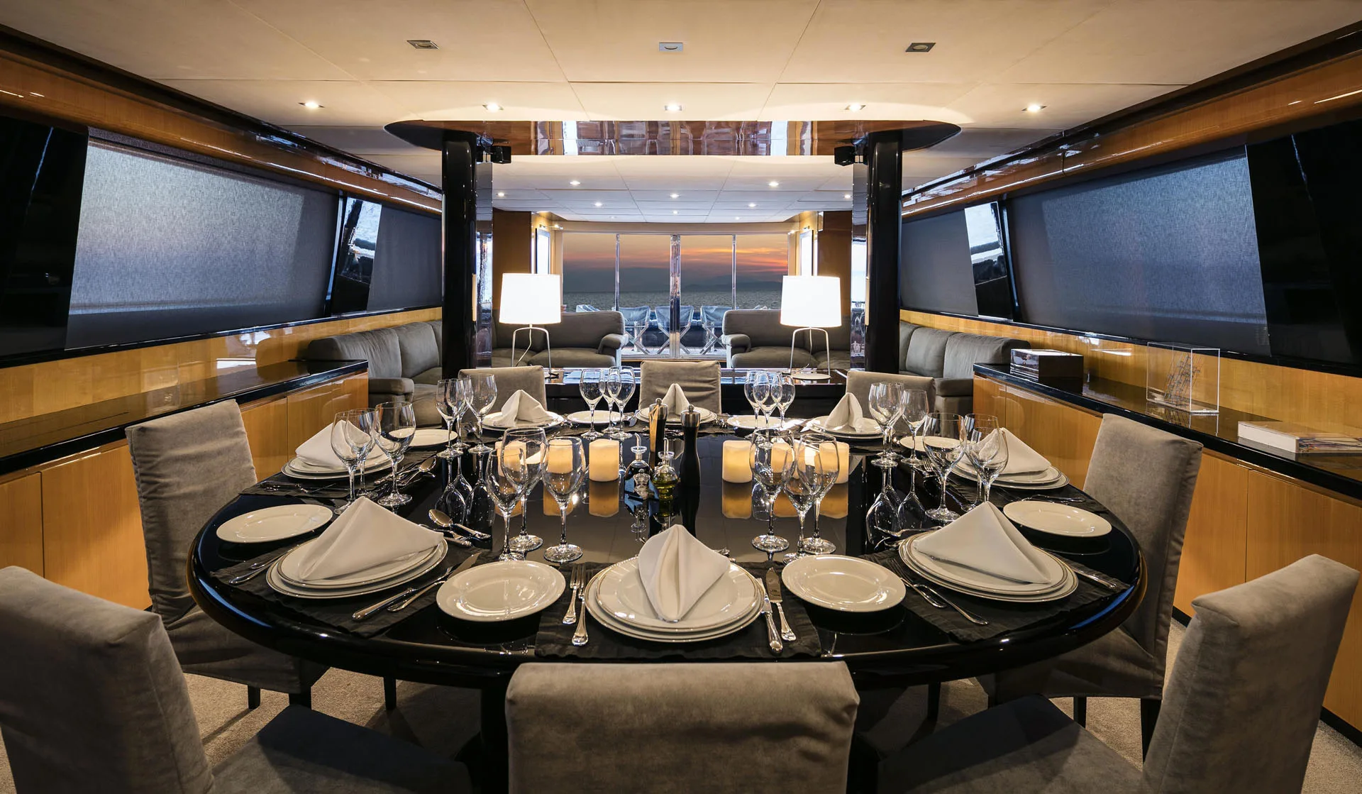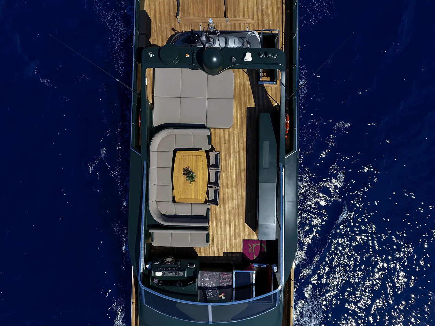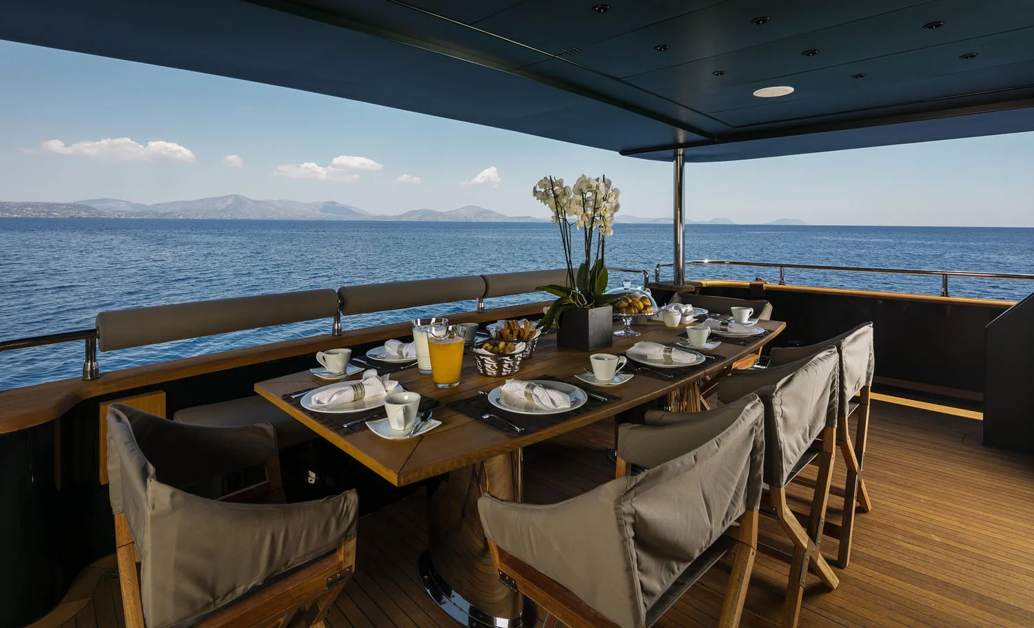 – Comfortable dining table on the upper deck for 22 guests