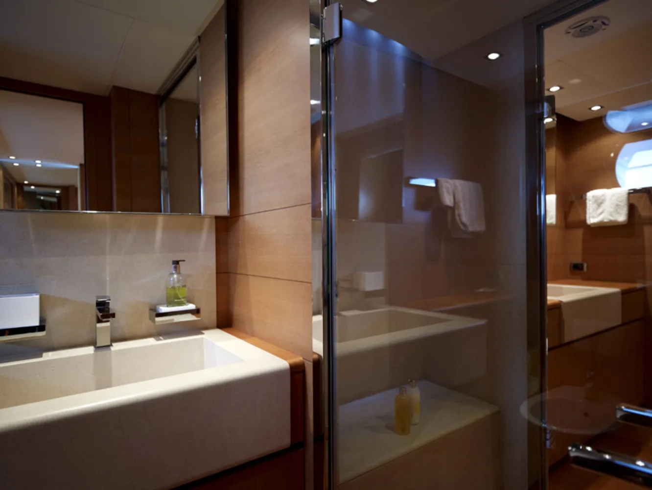 -Main Deck: Office area converts into a fifth cabin with a double bed and en suite facilities.
