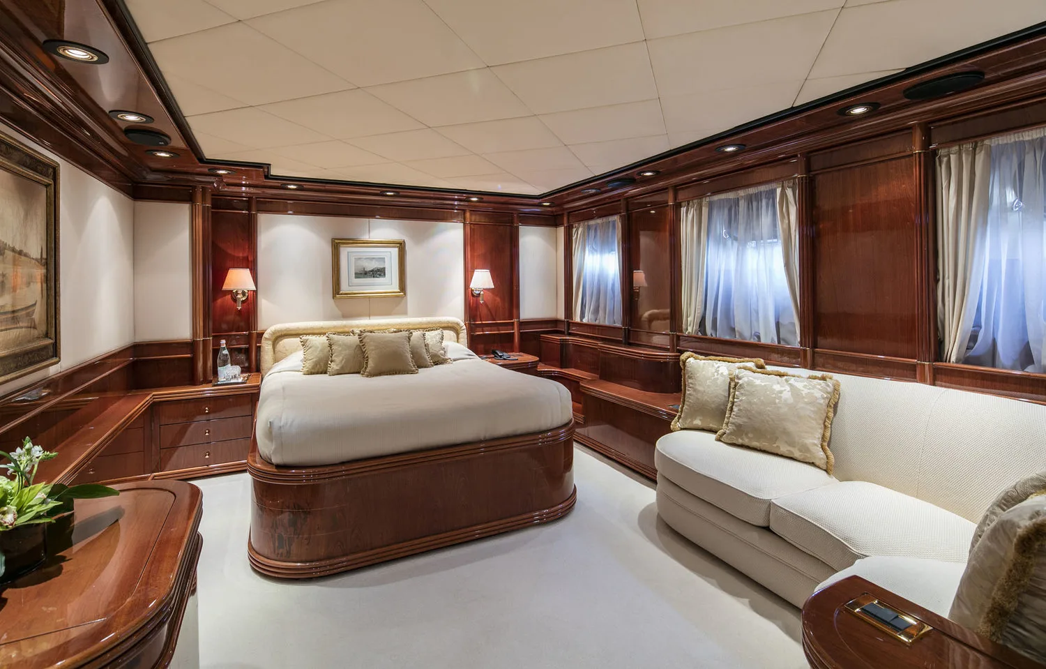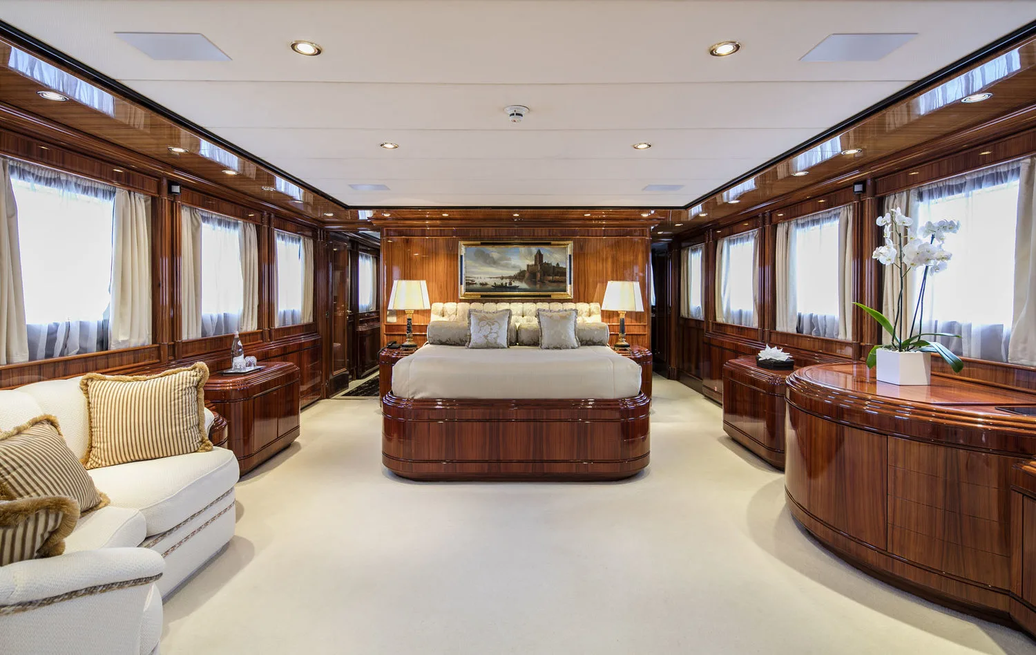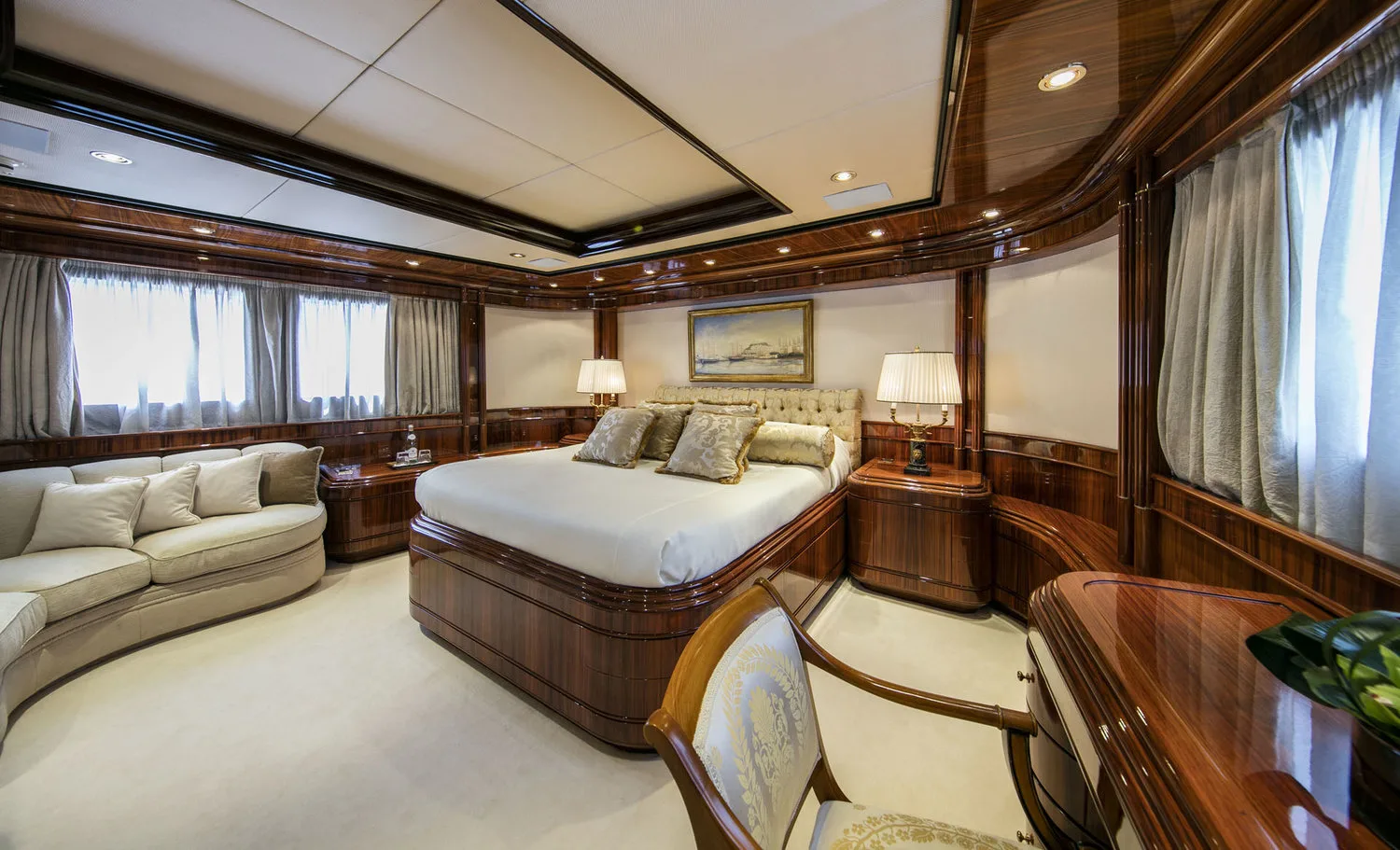 -One full beam Master stateroom on the upper deck, with king size bed, walk-in closet, saloon, office, TV, and shower.