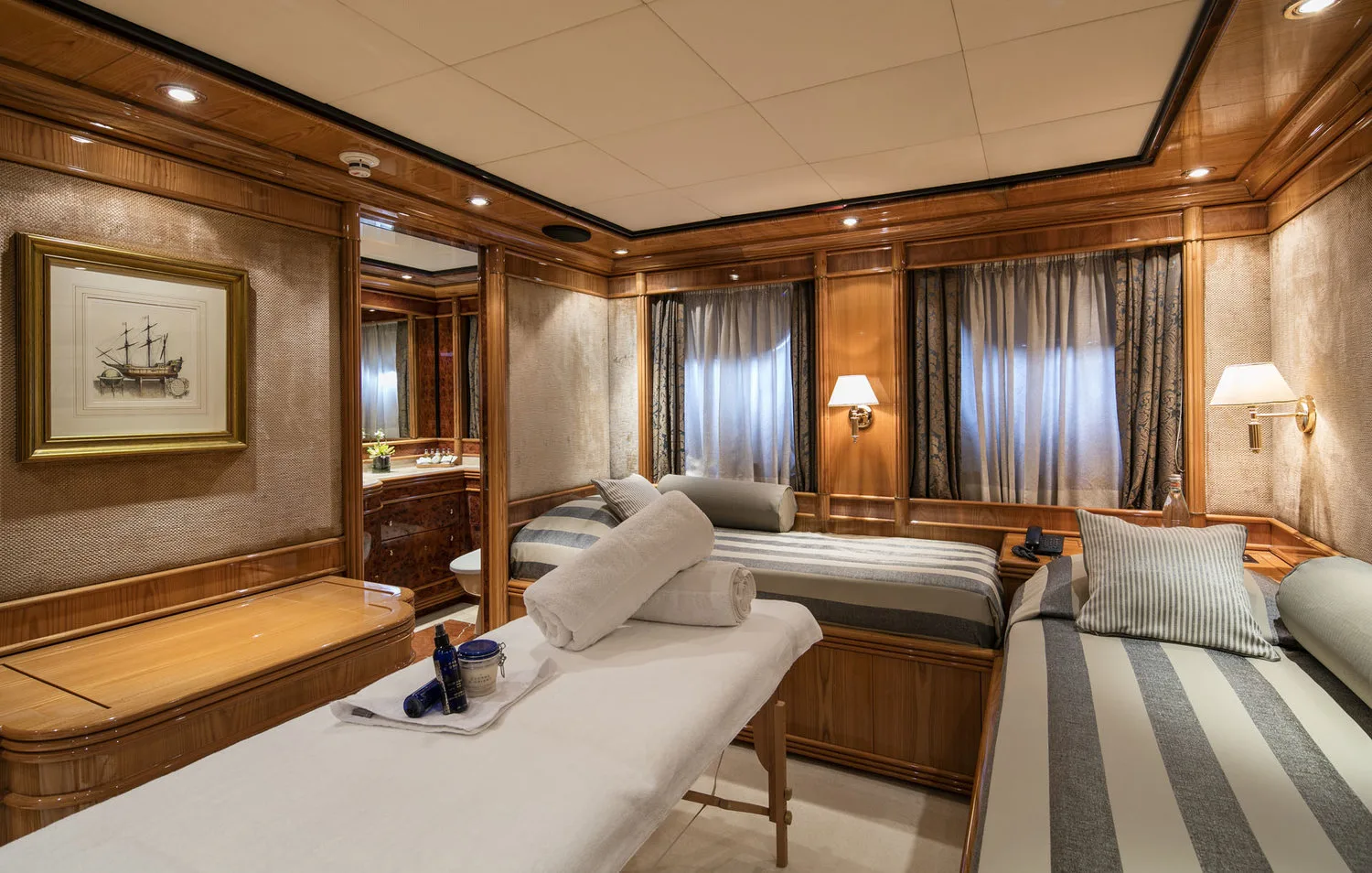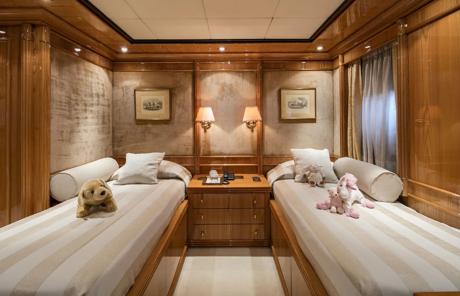 -Two Twin cabins on the lower deck, with two single beds, walk-in closet, that can be converted into a spacious stateroom, by a sliding door.
