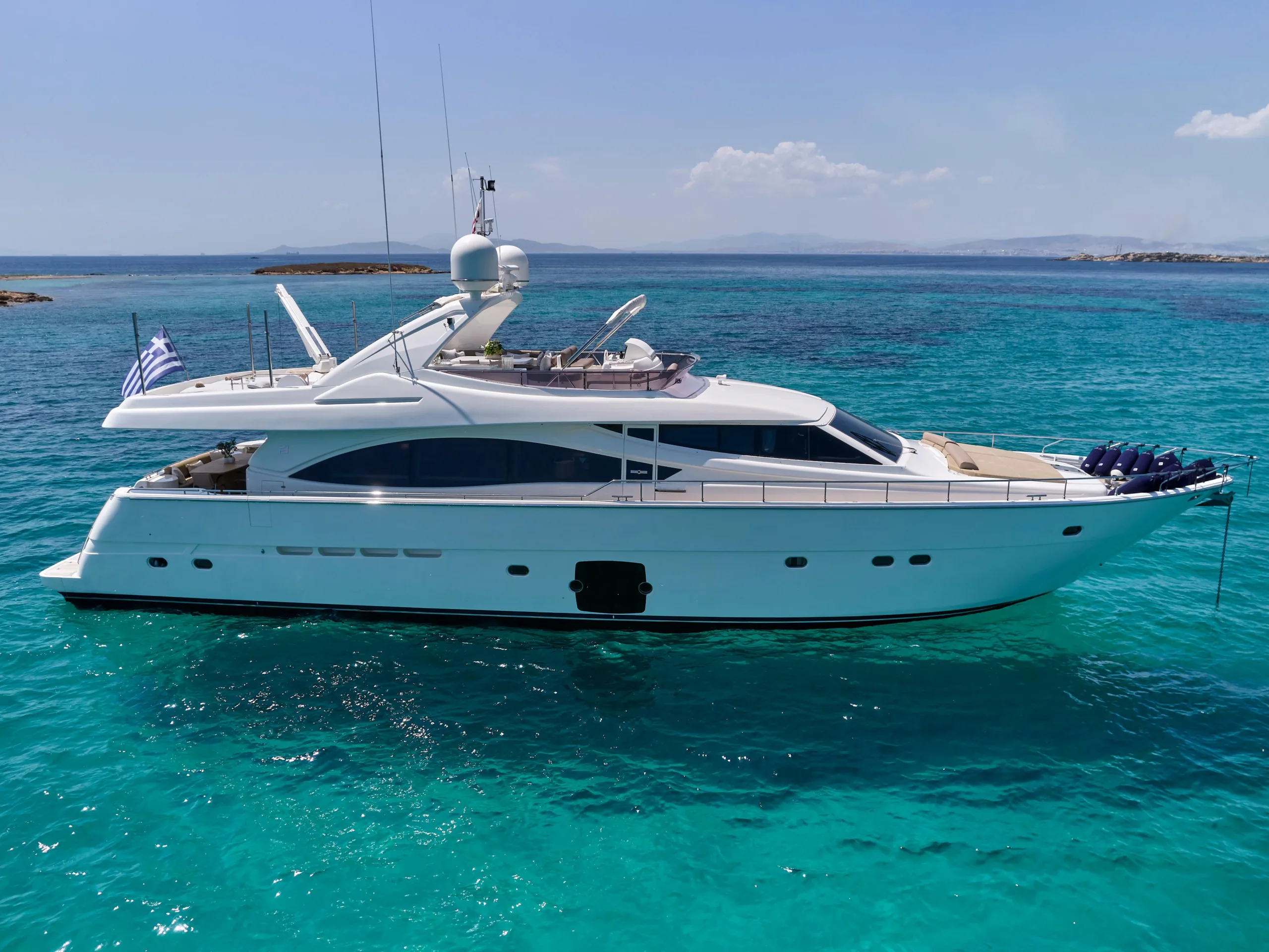 TypeMotor BoatLength25.30mBeam6.26mDraft1.9mGuests8Cabins4Crew5Price Range36,500-44,500€/weekSummer CruisingMediterraneanBuilt2008Refit2022BuilderFerretti YachtsShare