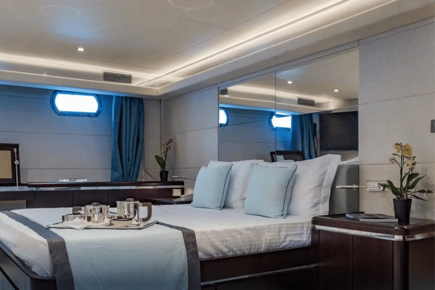 The yacht features a full-beam master suite, a VIP cabin, and flexible options