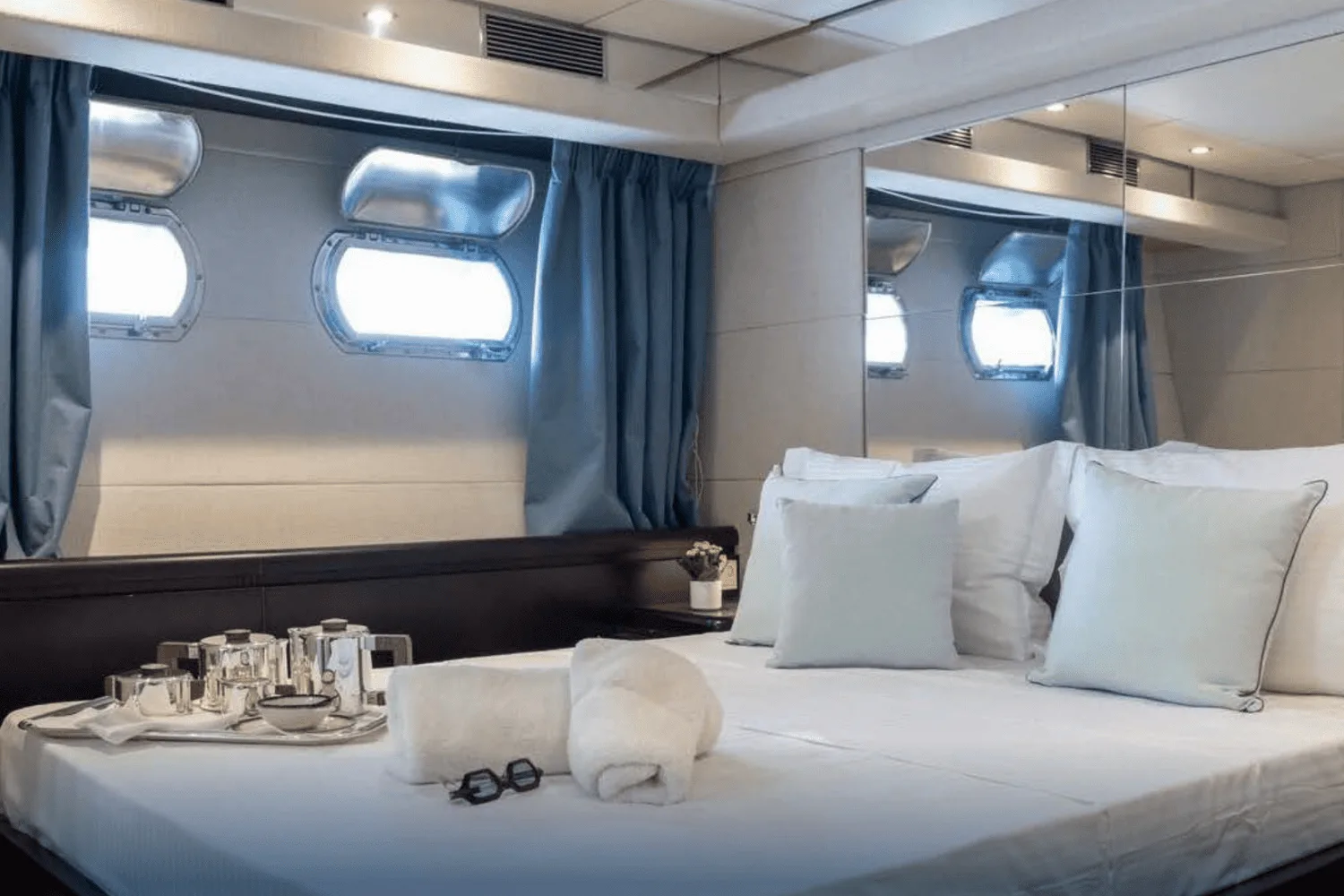 including double, twin, and convertible cabins. The interior and exterior of MY