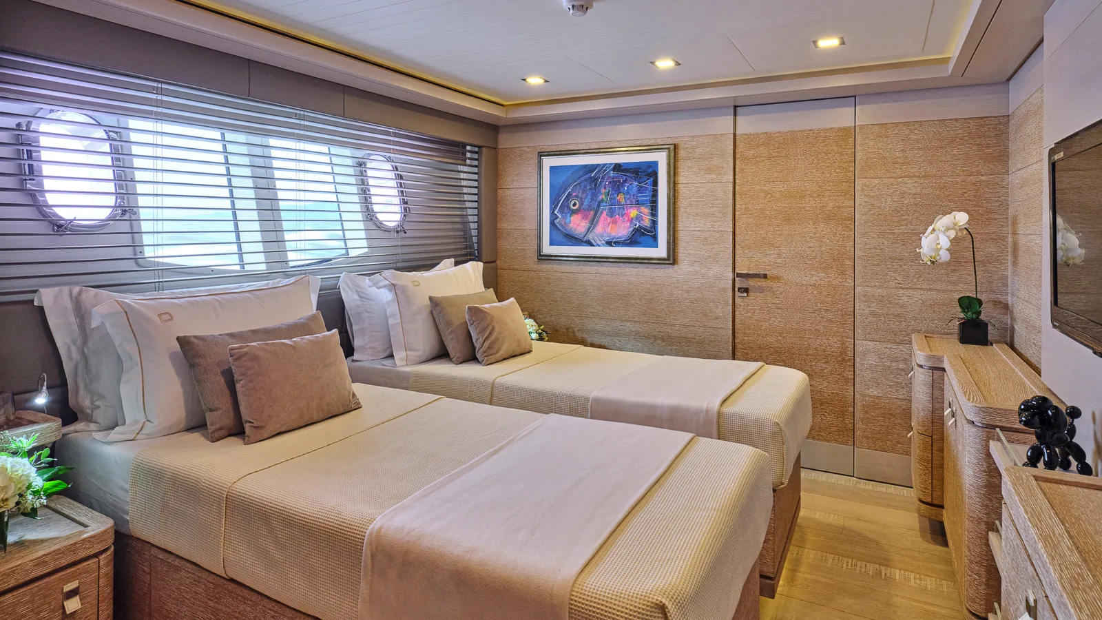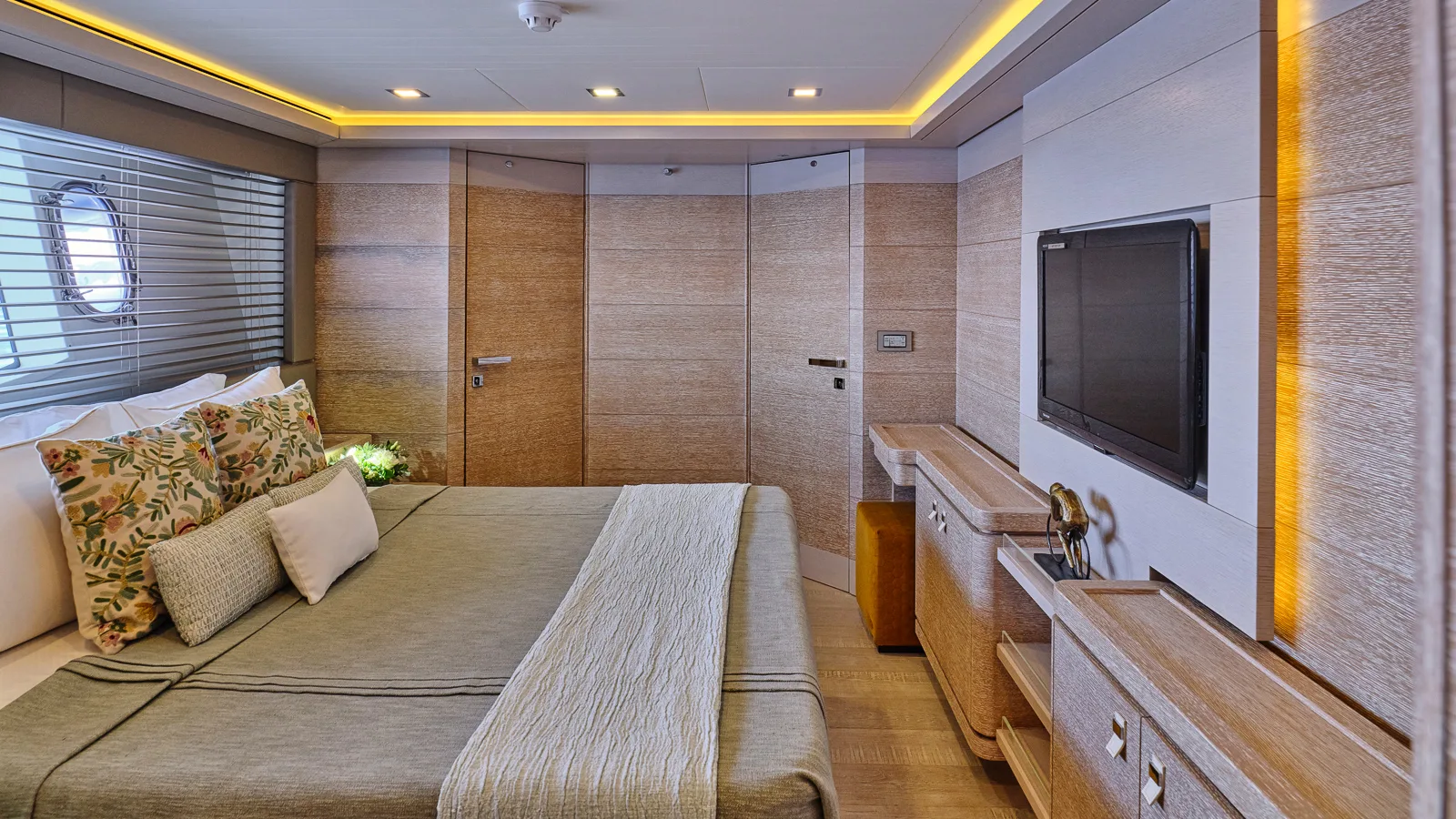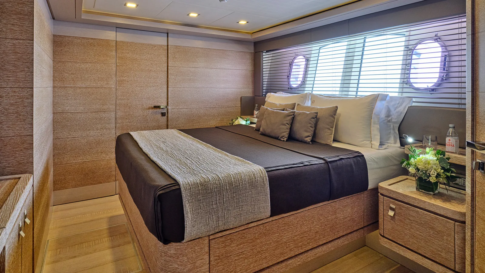 Master cabin located on the main deck with walk-in wardrobe; four further cabins on lower deck for a total of five.