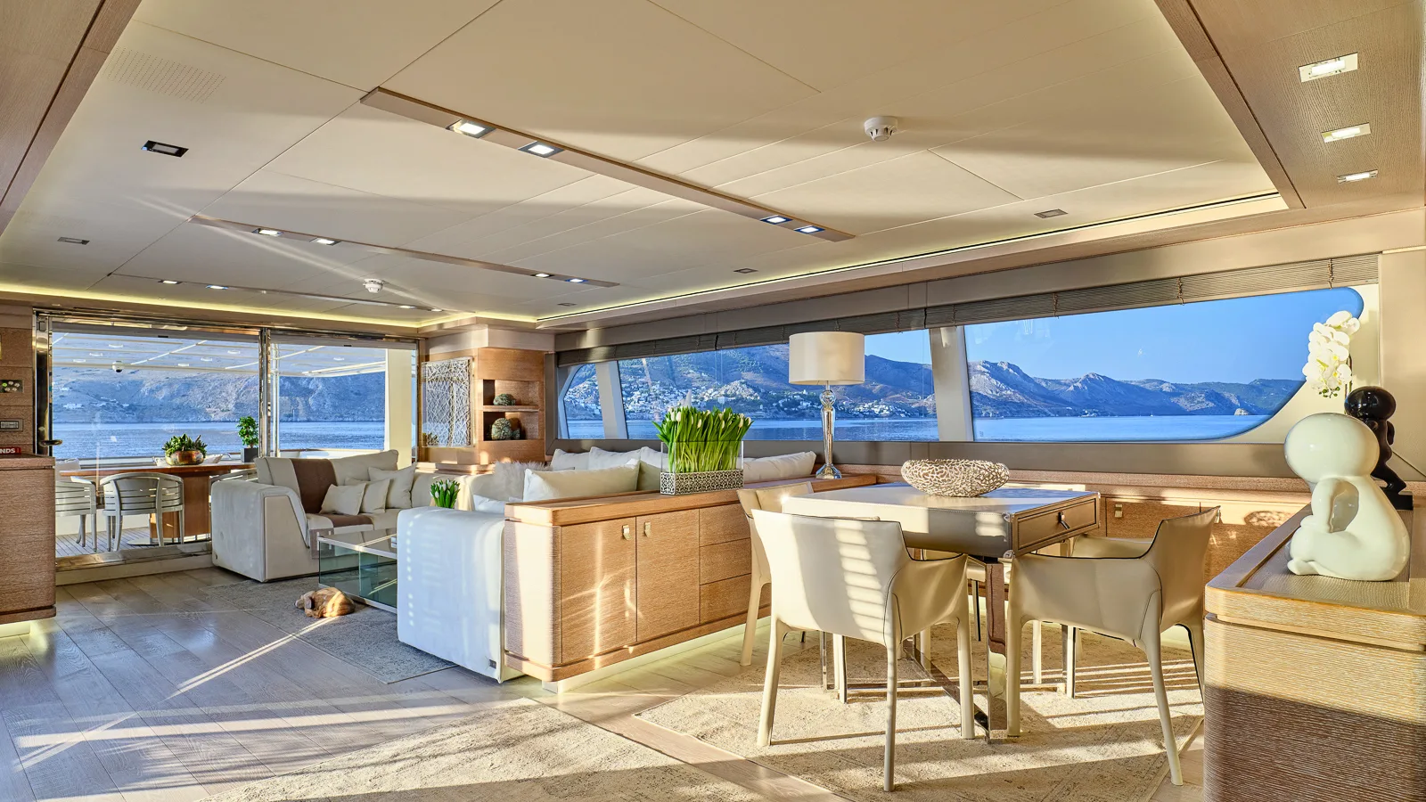 The interior is modern and flooded with natural light via large windows, with a dedicated dining area on the upper deck.
