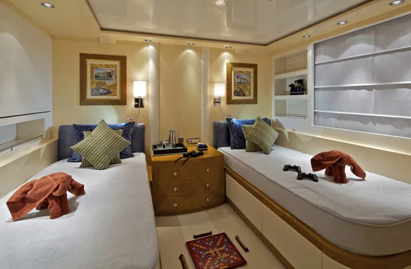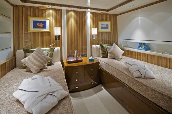 -Main Deck: One large owner’s suite located on the main deck with king size bed, en suite bathroom including Jacuzzi and shower room, and walk-in wardrobe. One twin guest cabin with en-suite bathroom and a Pullman berth.